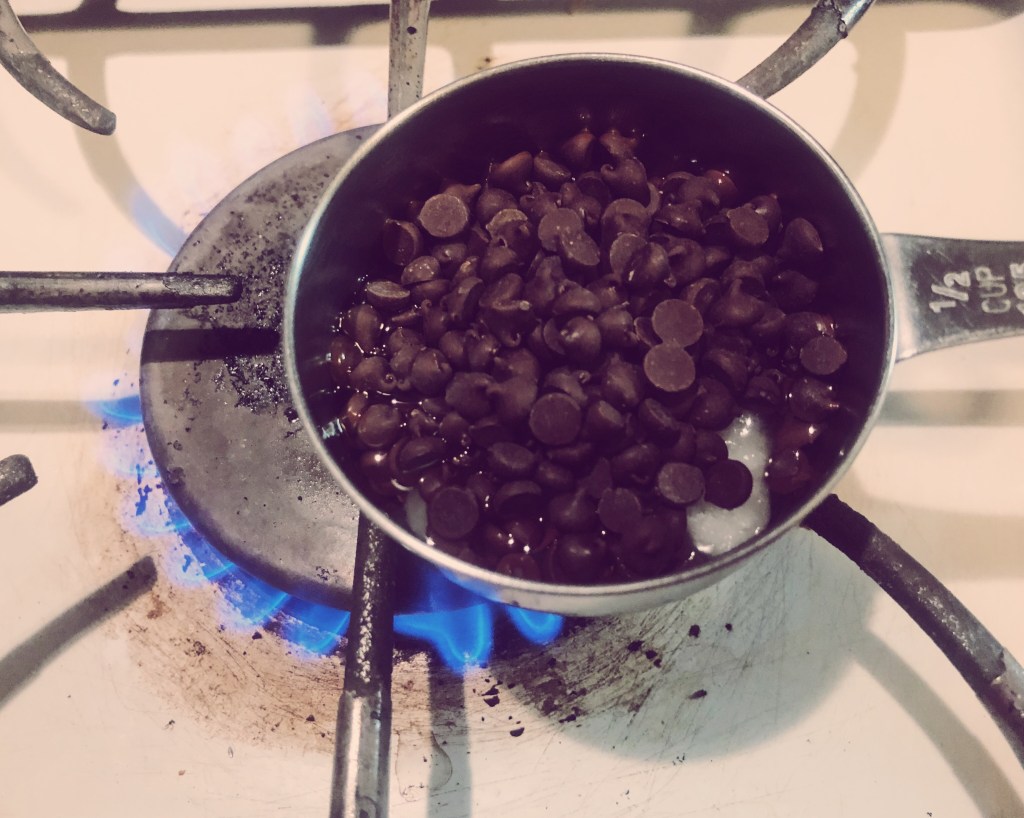 - In a small saucepan, melt your coconut oil and chocolate. I usually make about 1/2 cup at a time, using 4 tablespoons of chocolate chips and 1 tablespoon of coconut oil. You can scale this up or down as you like. Stir until smooth.