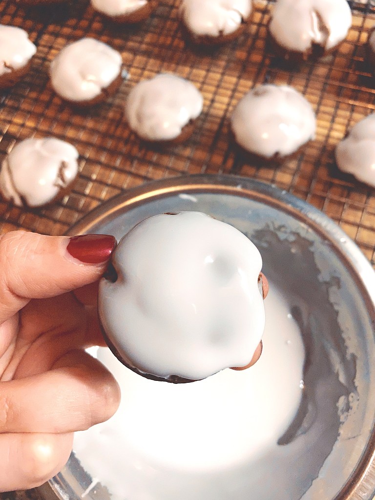 Whisk together the glaze in a small bowl, then dip each cookie’s rounded top into the glaze, then hold it upside down over the bowl to let the excess drip off. Dry iced cookies for at least 2 hours.