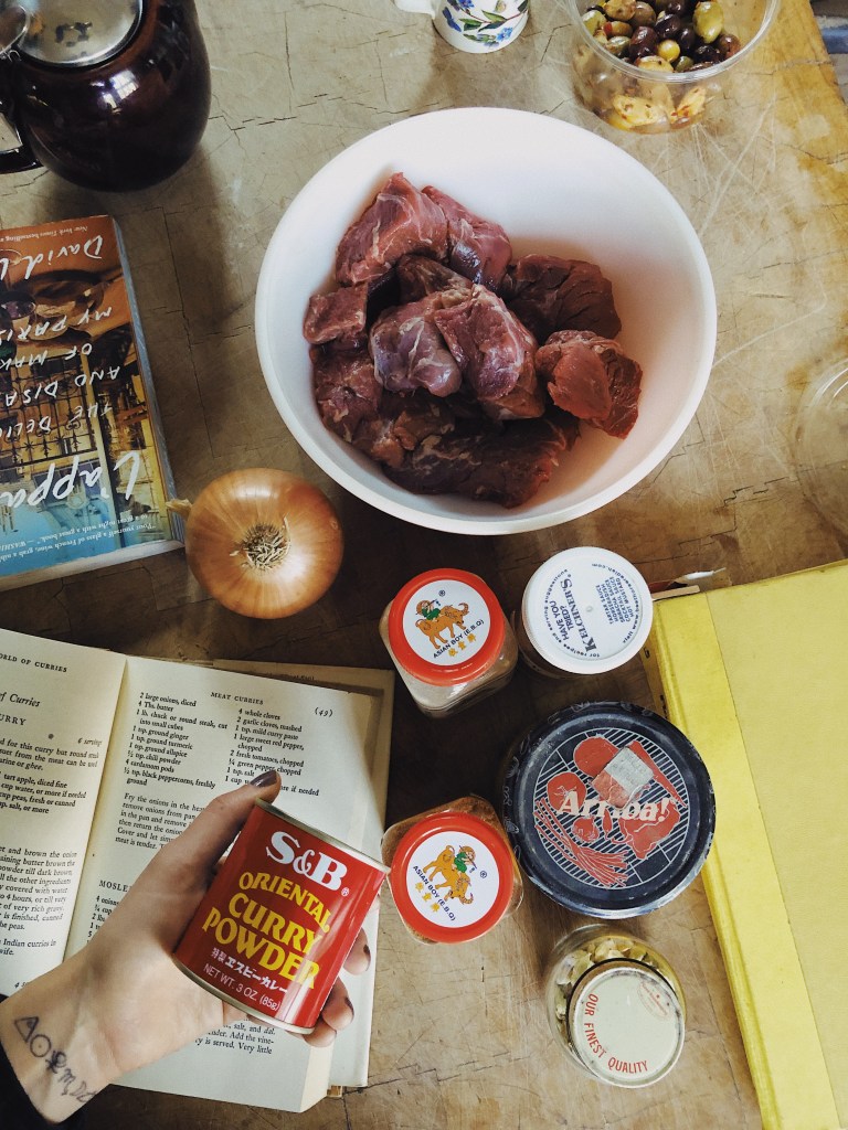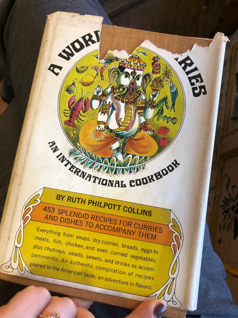 On our way upstate, we grabbed an onion, a bottle of cooking sherry, and some beef chuck from the grocery store in Brooklyn. That would be the basis for our meal. After a quick inspection I found a book called A World of Curry, published in 1968 by an American housewife who’d spent some time in “The Orient.”