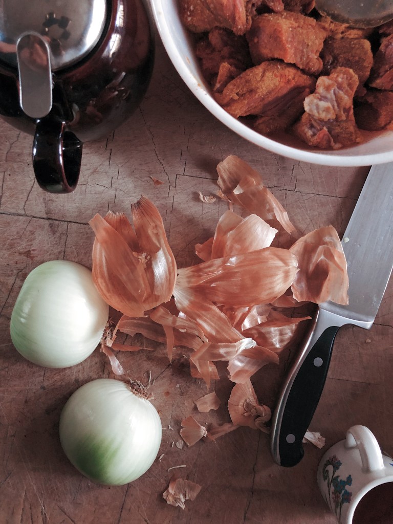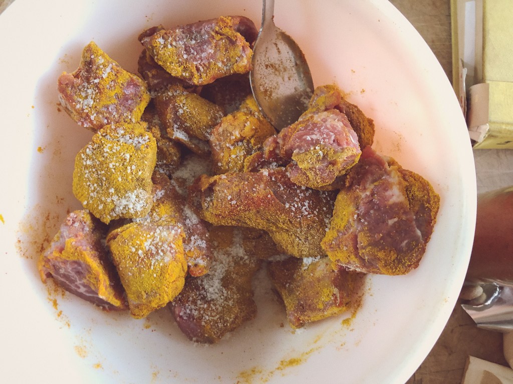 The first thing I did when making this recipe was not slicing or frying onions, but seasoning the meat. I find that a lot of people are shy about seasoning meat, and there’s no reason to be — it’s hard to over-season, but very easy to cook some bland, boring beef chuck. I dry-rubbed the meat with a combination of salt, pepper, curry powder, and ginger, gave it a good massage, and let it sit in a mixing bowl while I did everything else. The result is always tender and flavorful meat.